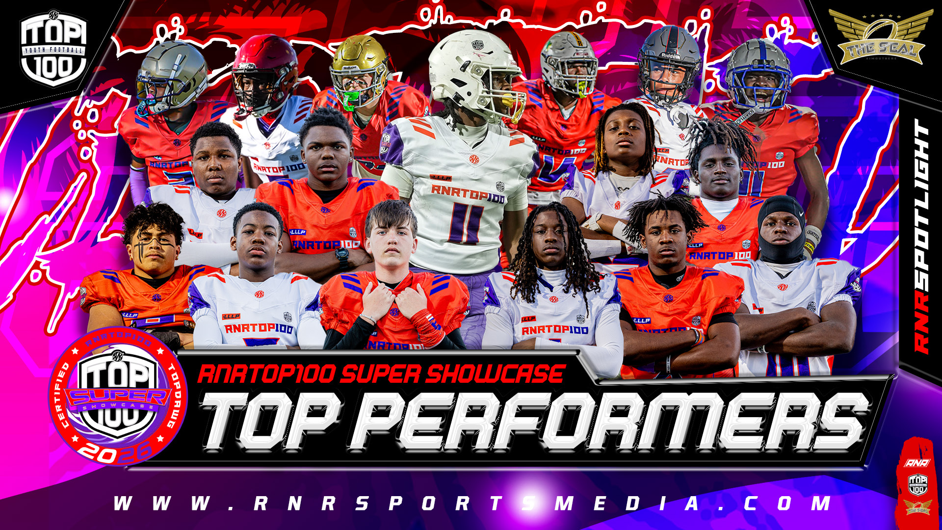 The RNR Top 100 Super Showcase is an invite-only national platform featuring the top youth football prospects in the country. Players are hand-selected by RNR Top 100 & The Seal Sports. Evaluations are based on practice performance, scrimmage reps, competitive drills, and full showcase game impact.