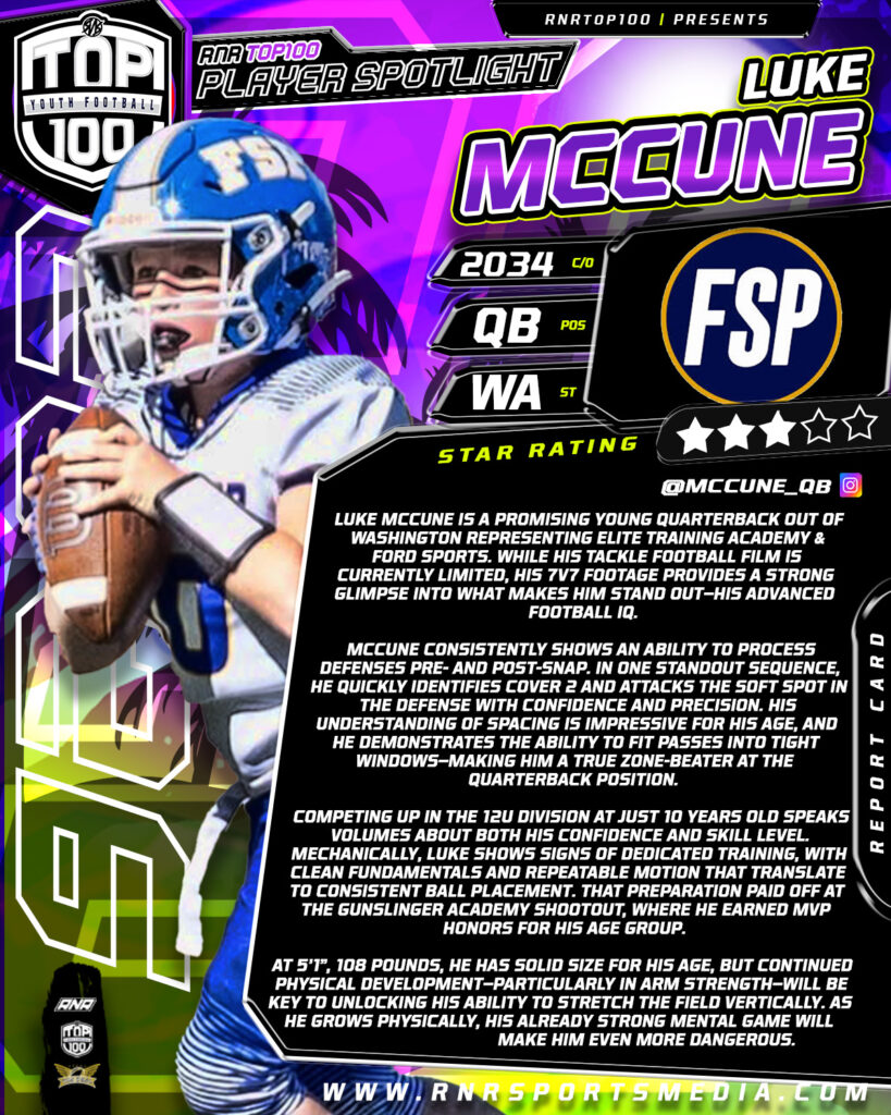 Luke McCune is an intelligent, fundamentally sound young QB with strong instincts and advanced field awareness. As his physical tools continue to develop, expect him to emerge as one of the premier quarterbacks in Washington for the 2034 class.