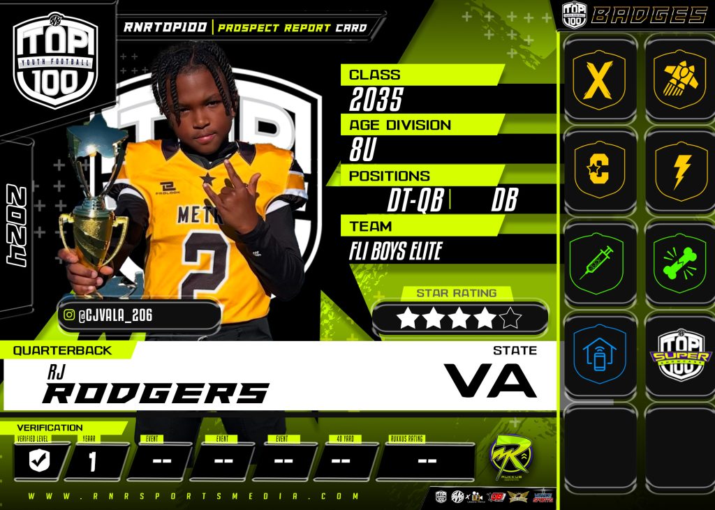 RNR Top 100 Prospect Report Name: R.J Rodgers Position: QB-DT Team : Fli Boys Elite (VA) 8U Class : 2035 Skinny: When it comes to electrifying playmakers in youth football, Virginia’s own R.J. Rodgers is making a strong case for early recognition as one of the top talents in the Class of 2035. Representing […]