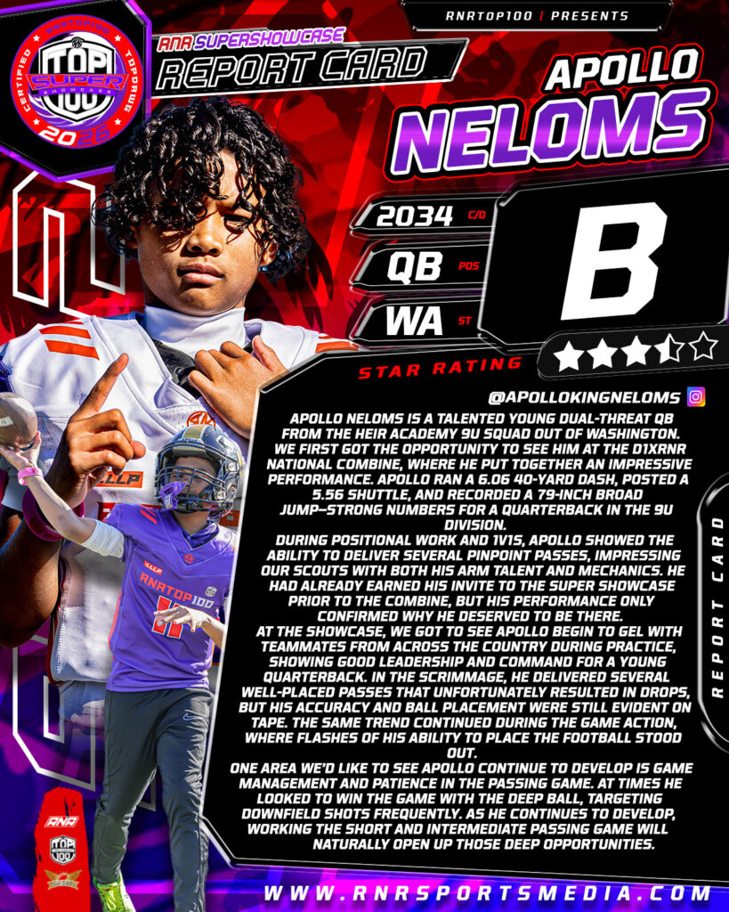 With his current skill set, competitive drive, and natural talent, Apollo Neloms has a lot of upside and is definitely a young QB to keep an eye on in the coming years.
