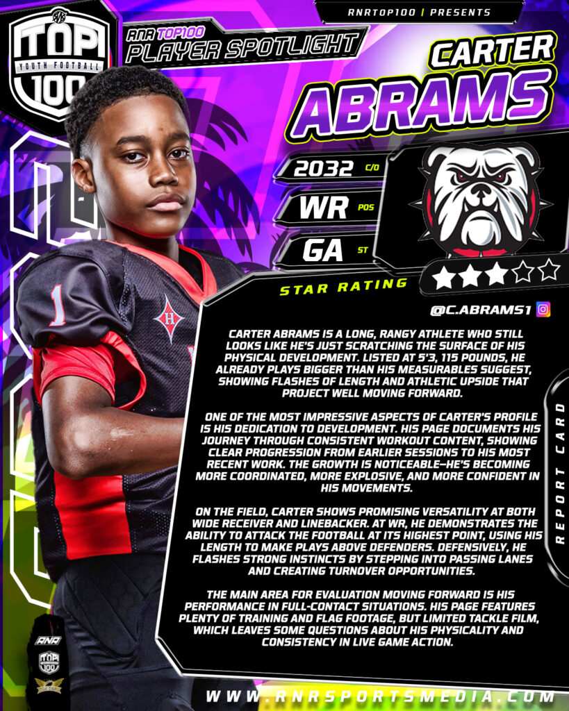 Carter Abrams is a long, rangy athlete who still looks like he’s just scratching the surface of his physical development. Listed at 5’3, 115 pounds, he already plays bigger than his measurables suggest, showing flashes of length and athletic upside that project well moving forward.
