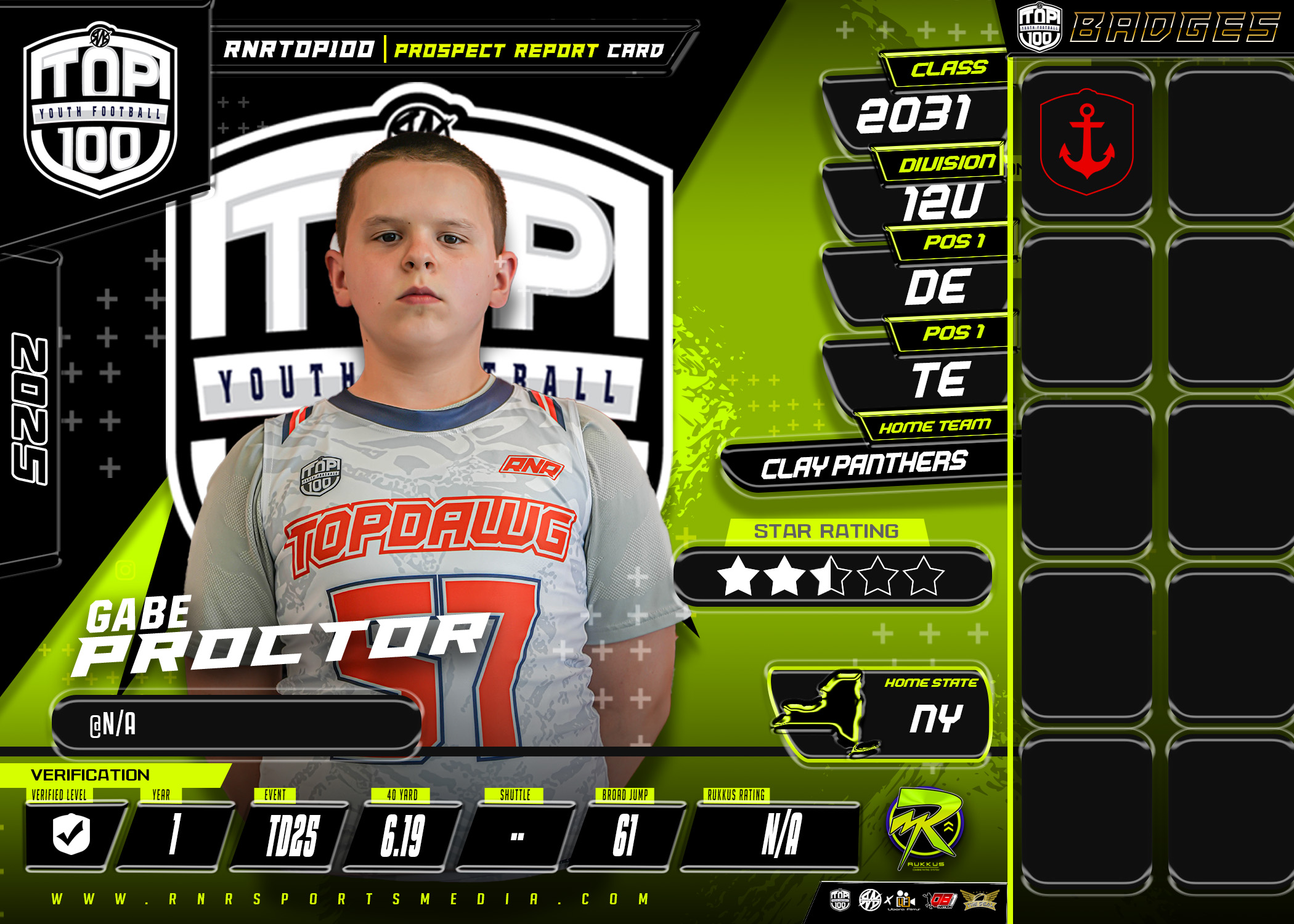 Gabe Proctor is a young defensive end and tight end prospect from New York who currently suits up for CBA Syracuse. Standing at 5’2” and 132 pounds, Gabe is on the smaller side for his division and positional expectations. While his frame is still developing, he compensates with high energy, effort, and a noticeable willingness to learn — qualities that often separate long-term contributors from short-term athletes.