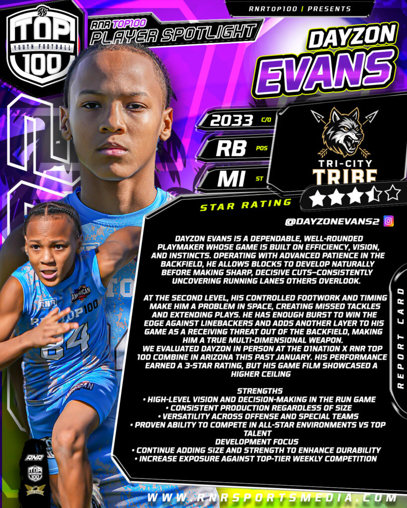 Dayzon Evans is a dependable, well-rounded playmaker whose game is built on efficiency, vision, and instincts. Operating with advanced patience in the backfield, he allows blocks to develop naturally before making sharp, decisive cuts—consistently uncovering running lanes others overlook.